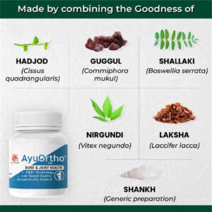 AyuOrtho tablet ingredients help in various Bone & Joints health benefits like Hadjod & Guggul helps in bone mineralization, Shallaki & Nirgundi helps countering inflammation & pain, Laksha for healing, Shankh is a natural source for Calcium. AyuOrtho oil ingredients help in countering inflammation and relieves joint pain like Mahanarayan tail is a well-known traditional oil useful in various arthritis conditions, Dashmool tail is a traditional oil for strengthening muscles, Gandhpura tail relieves joint pian, Pudina sattav acta as anti-inflammatory agent, Camphor acts as local anesthetic, and Nilgiri tail will act as counter-irritant.